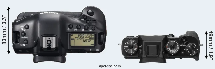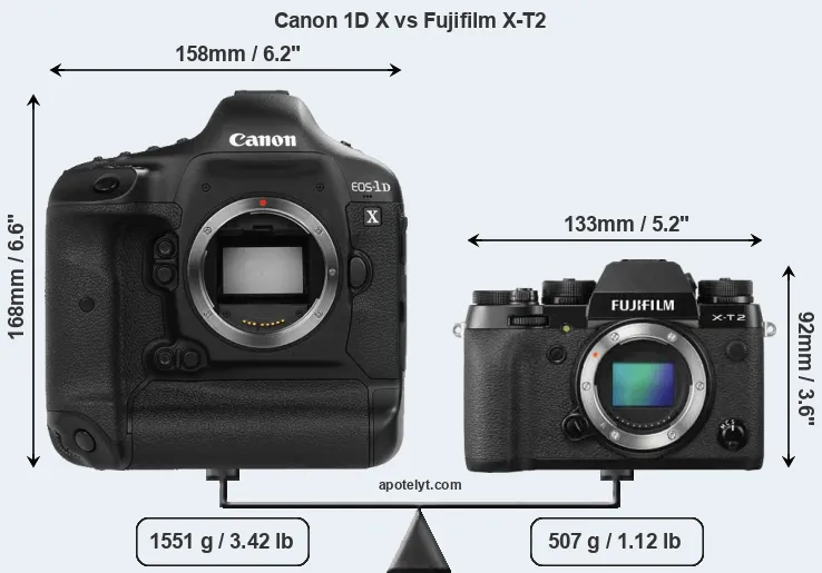 An illustration of the physical size and weight of the Canon 1D X and the Fujifilm X-T2 is provided in the side-by-side display below. The two cameras are presented according to their relative size. Three consecutive views from the front, the top, and the rear side are shown. All size dimensions are rounded to the nearest millimeter.