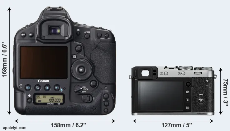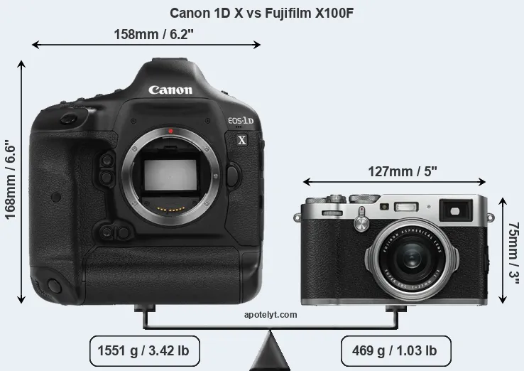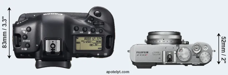 The side-by-side display below illustrates the physical size and weight of the Canon 1D X and the Fujifilm X100F. The two cameras are presented according to their relative size. Three consecutive views from the front, the top, and the rear side are shown. All width, height and depth dimensions are rounded to the nearest millimeter.