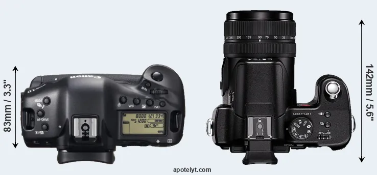 The side-by-side display below illustrates the physical size and weight of the Canon 1D X and the Leica V-LUX 1. The two cameras are presented according to their relative size. Three consecutive perspectives from the front, the top, and the back are available. All width, height and depth dimensions are rounded to the nearest millimeter.