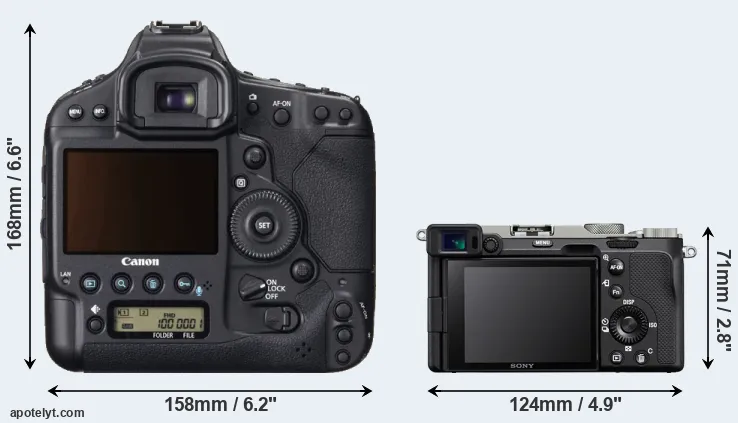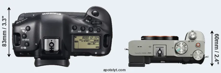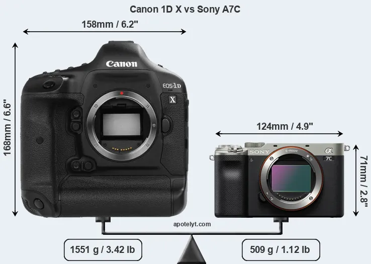 The side-by-side display below illustrates the physical size and weight of the Canon 1D X and the Sony A7C. The two cameras are presented according to their relative size. Three consecutive views from the front, the top, and the rear side are shown. All width, height and depth measures are rounded to the nearest millimeter.