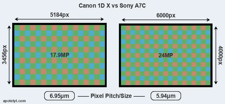 Despite having a slightly smaller sensor, the A7C offers a higher resolution of 24 megapixels, compared with 17.9 MP of the 1DX. This megapixels advantage comes at the cost of a higher pixel density and a smaller size of the individual pixel (with a pixel pitch of 5.94μm versus 6.95μm for the 1DX). However, it should be noted that the A7C is much more recent (by 8 years and 11 months) than the 1DX, and its sensor will have benefitted from technological advances during this time that make it possible to gather light more efficiently.