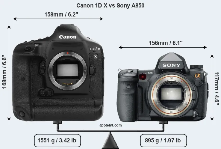The physical size and weight of the Canon 1D X and the Sony A850 are illustrated in the side-by-side display below. The two cameras are presented according to their relative size. Three consecutive perspectives from the front, the top, and the back are available. All width, height and depth dimensions are rounded to the nearest millimeter.