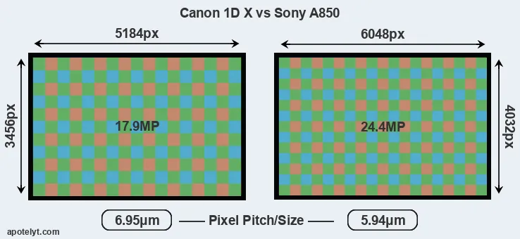 Despite having a slightly smaller sensor, the A850 offers a higher resolution of 24.4 megapixels, compared with 17.9 MP of the 1DX. This megapixels advantage comes at the cost of a higher pixel density and a smaller size of the individual pixel (with a pixel pitch of 5.94μm versus 6.95μm for the 1DX). Moreover, it should be noted that the 1DX is much more recent (by 2 years and 1 month) than the A850, and its sensor will have benefitted from technological advances during this time that further enhance the light gathering capacity of its pixels.