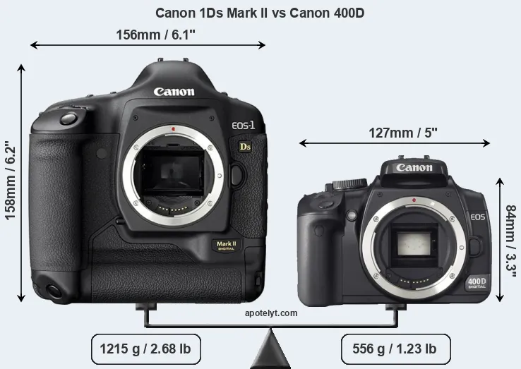 The physical size and weight of the Canon 1Ds Mark II and the Canon 400D are illustrated in the side-by-side display below. The two cameras are presented according to their relative size. Three consecutive views from the front, the top, and the rear side are shown. All width, height and depth measures are rounded to the nearest millimeter.