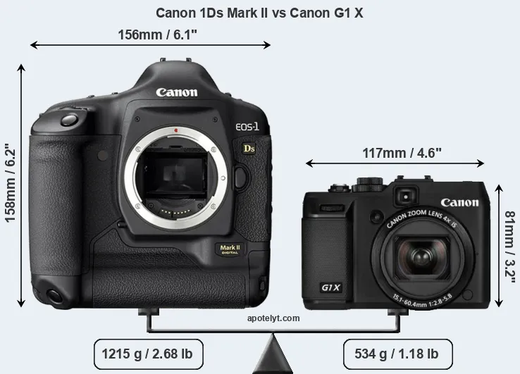 An illustration of the physical size and weight of the Canon 1Ds Mark II and the Canon G1 X is provided in the side-by-side display below. The two cameras are presented according to their relative size. Three successive views from the front, the top, and the rear are shown. All width, height and depth dimensions are rounded to the nearest millimeter.