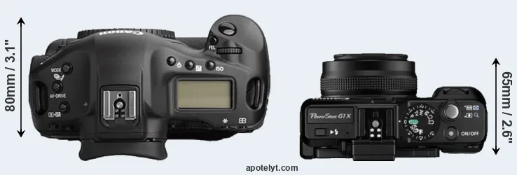 The above size and weight comparisons are to some extent incomplete and possibly misleading, as the G1X has a lens built in, whereas the 1Ds Mark II is an interchangeable lens camera that requires a separate lens. Attaching the latter will add extra weight and bulk to the setup. You can compare the optics available for the 1Ds Mark II and their specifications in the Canon EF Lens Catalog.