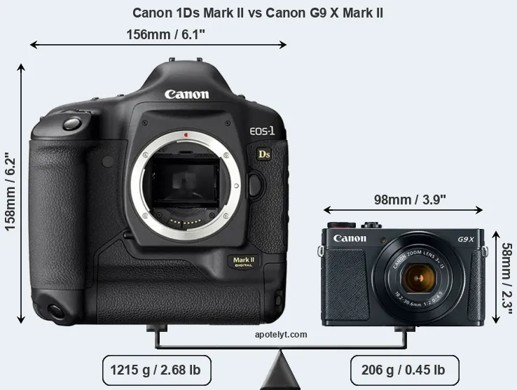 An illustration of the physical size and weight of the Canon 1Ds Mark II and the Canon G9 X Mark II is provided in the side-by-side display below. The two cameras are presented according to their relative size. Three successive views from the front, the top, and the rear are shown. All width, height and depth measures are rounded to the nearest millimeter.