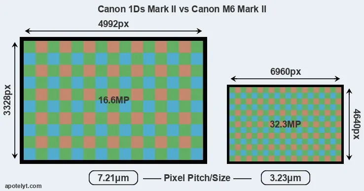 Despite having a smaller sensor, the M6 Mark II offers a higher resolution of 32.3 megapixels, compared with 16.6 MP of the 1Ds Mark II. This megapixels advantage comes at the cost of a higher pixel density and a smaller size of the individual pixel (with a pixel pitch of 3.23μm versus 7.21μm for the 1Ds Mark II). However, it should be noted that the M6 Mark II is much more recent (by 14 years and 11 months) than the 1Ds Mark II, and its sensor will have benefitted from technological advances during this time that make it possible to gather light more efficiently.