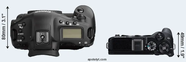 An illustration of the physical size and weight of the Canon 1Ds Mark II and the Canon M6 Mark II is provided in the side-by-side display below. The two cameras are presented according to their relative size. Three successive views from the front, the top, and the rear are shown. All width, height and depth dimensions are rounded to the nearest millimeter.