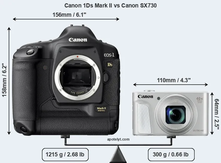 The physical size and weight of the Canon 1Ds Mark II and the Canon SX730 are illustrated in the side-by-side display below. The two cameras are presented according to their relative size. Three successive views from the front, the top, and the rear are shown. All width, height and depth dimensions are rounded to the nearest millimeter.