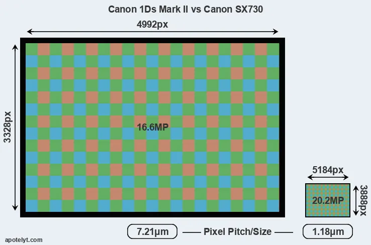 Despite having a smaller sensor, the SX730 offers a higher resolution of 20.2 megapixels, compared with 16.6 MP of the 1Ds Mark II. This megapixels advantage comes at the cost of a higher pixel density and a smaller size of the individual pixel (with a pixel pitch of 1.18μm versus 7.21μm for the 1Ds Mark II). However, it should be noted that the SX730 is much more recent (by 12 years and 6 months) than the 1Ds Mark II, and its sensor will have benefitted from technological advances during this time that make it possible to gather light more efficiently. Coming back to sensor resolution, it should be mentioned that the SX730 has no anti-alias filter installed, so that it can capture all the detail its sensor resolves.