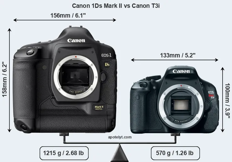 The physical size and weight of the Canon 1Ds Mark II and the Canon T3i are illustrated in the side-by-side display below. The two cameras are presented according to their relative size. Three consecutive perspectives from the front, the top, and the back are available. All size dimensions are rounded to the nearest millimeter.