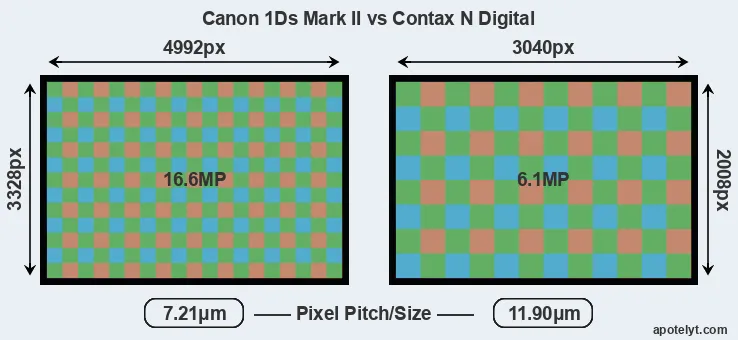 While the two cameras under review share the same sensor size, the 1Ds Mark II offers a higher resolution of 16.6 megapixels, compared with 6.1 MP of the N Digital. This megapixels advantage translates into a 64 percent gain in linear resolution. On the other hand, these sensor specs imply that the 1Ds Mark II has a higher pixel density and a smaller size of the individual pixel (with a pixel pitch of 7.21μm versus 11.90μm for the N Digital). In this context, it should be noted, however, that the 1Ds Mark II is much more recent (by 2 years and 6 months) than the N Digital, and its sensor will have benefitted from technological advances during this time that compensate for the smaller pixel size.