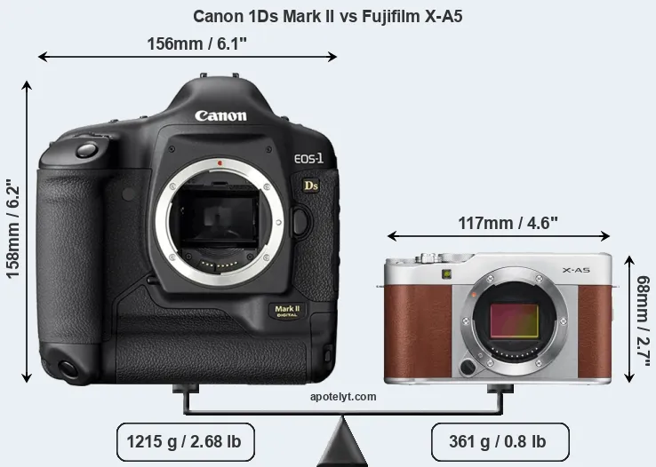 The side-by-side display below illustrates the physical size and weight of the Canon 1Ds Mark II and the Fujifilm X-A5. The two cameras are presented according to their relative size. Three consecutive perspectives from the front, the top, and the back are available. All width, height and depth measures are rounded to the nearest millimeter.