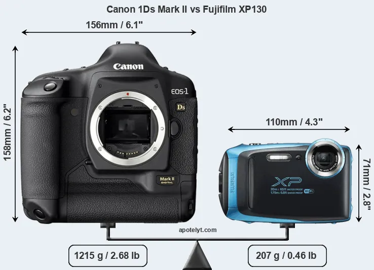 The side-by-side display below illustrates the physical size and weight of the Canon 1Ds Mark II and the Fujifilm XP130. The two cameras are presented according to their relative size. Three consecutive views from the front, the top, and the rear side are shown. All width, height and depth dimensions are rounded to the nearest millimeter.