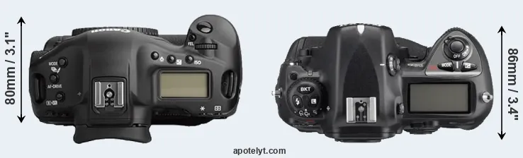The side-by-side display below illustrates the physical size and weight of the Canon 1Ds Mark II and the Nikon D2Xs. The two cameras are presented according to their relative size. Three consecutive views from the front, the top, and the rear side are shown. All size dimensions are rounded to the nearest millimeter.