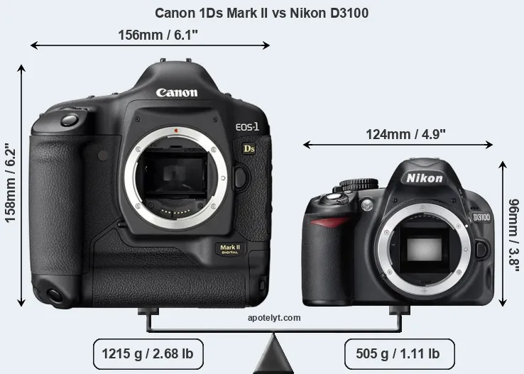 The side-by-side display below illustrates the physical size and weight of the Canon 1Ds Mark II and the Nikon D3100. The two cameras are presented according to their relative size. Three consecutive views from the front, the top, and the rear side are shown. All width, height and depth dimensions are rounded to the nearest millimeter.