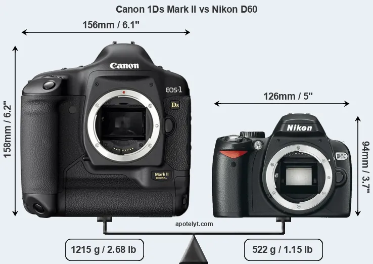 The side-by-side display below illustrates the physical size and weight of the Canon 1Ds Mark II and the Nikon D60. The two cameras are presented according to their relative size. Three successive views from the front, the top, and the rear are shown. All width, height and depth measures are rounded to the nearest millimeter.