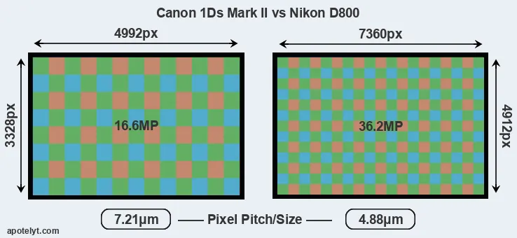 Despite having a slightly smaller sensor, the D800 offers a higher resolution of 36.2 megapixels, compared with 16.6 MP of the 1Ds Mark II. This megapixels advantage comes at the cost of a higher pixel density and a smaller size of the individual pixel (with a pixel pitch of 4.88μm versus 7.21μm for the 1Ds Mark II). However, it should be noted that the D800 is much more recent (by 7 years and 4 months) than the 1Ds Mark II, and its sensor will have benefitted from technological advances during this time that make it possible to gather light more efficiently.