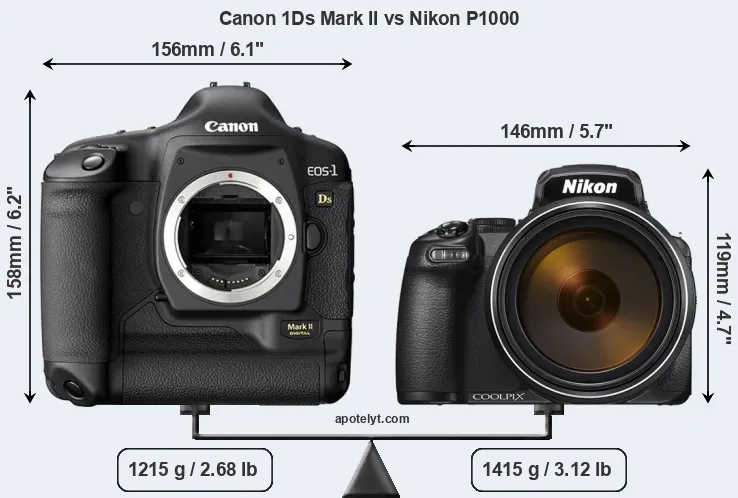 The physical size and weight of the Canon 1Ds Mark II and the Nikon P1000 are illustrated in the side-by-side display below. The two cameras are presented according to their relative size. Three consecutive perspectives from the front, the top, and the back are available. All width, height and depth dimensions are rounded to the nearest millimeter.