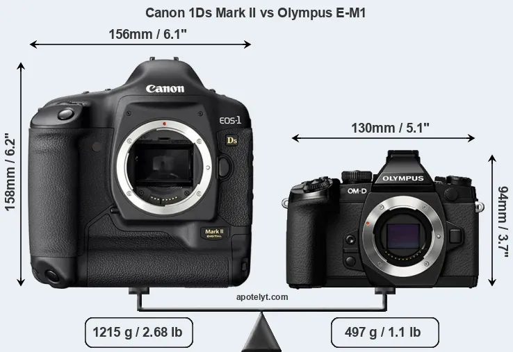 If the front view area (width x height) of the cameras is taken as an aggregate measure of their size, the Olympus E-M1 is considerably smaller (50 percent) than the Canon 1Ds Mark II. Moreover, the E-M1 is substantially lighter (59 percent) than the 1Ds Mark II. In this context, it is worth noting that both cameras are splash and dust-proof and can, hence, be used in inclement weather conditions or harsh environments.