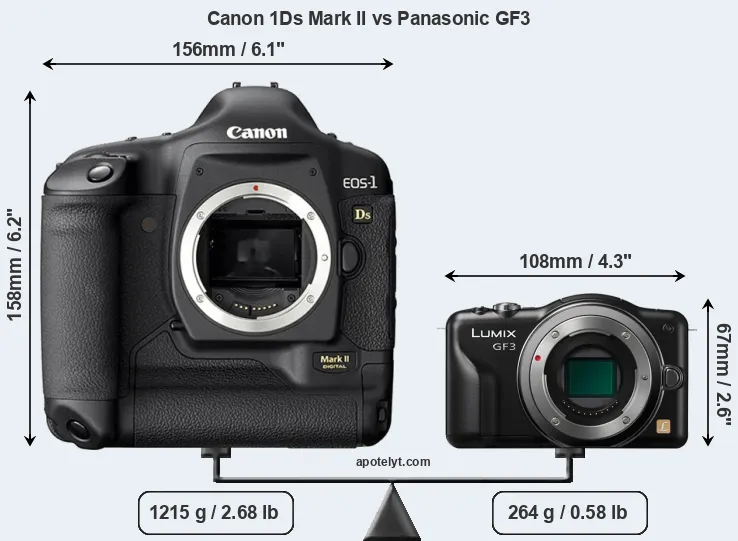 The side-by-side display below illustrates the physical size and weight of the Canon 1Ds Mark II and the Panasonic GF3. The two cameras are presented according to their relative size. Three consecutive perspectives from the front, the top, and the back are available. All width, height and depth measures are rounded to the nearest millimeter.