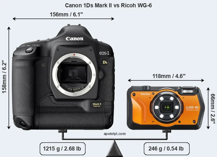 The side-by-side display below illustrates the physical size and weight of the Canon 1Ds Mark II and the Ricoh WG-6. The two cameras are presented according to their relative size. Three consecutive views from the front, the top, and the rear side are shown. All width, height and depth measures are rounded to the nearest millimeter.