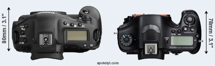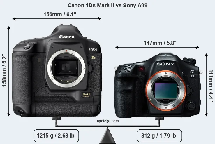 An illustration of the physical size and weight of the Canon 1Ds Mark II and the Sony A99 is provided in the side-by-side display below. The two cameras are presented according to their relative size. Three successive views from the front, the top, and the rear are shown. All width, height and depth dimensions are rounded to the nearest millimeter.