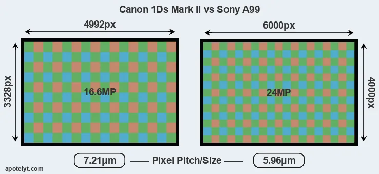 Despite having a slightly smaller sensor, the A99 offers a higher resolution of 24 megapixels, compared with 16.6 MP of the 1Ds Mark II. This megapixels advantage comes at the cost of a higher pixel density and a smaller size of the individual pixel (with a pixel pitch of 5.96μm versus 7.21μm for the 1Ds Mark II). However, it should be noted that the A99 is much more recent (by 7 years and 11 months) than the 1Ds Mark II, and its sensor will have benefitted from technological advances during this time that make it possible to gather light more efficiently.