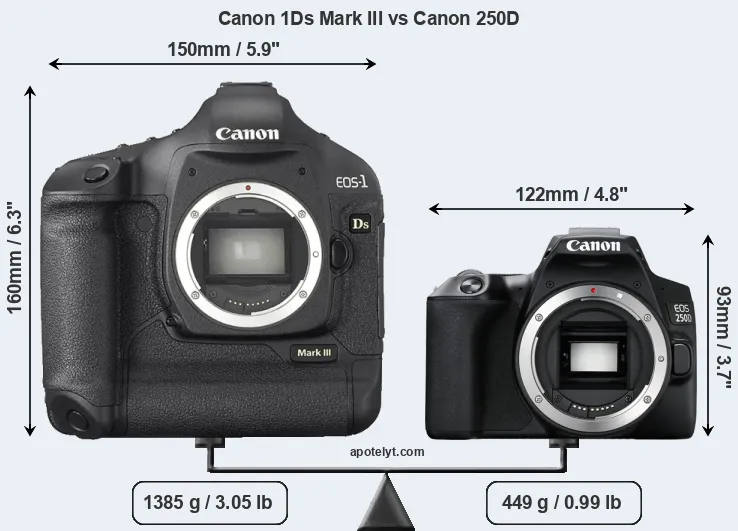 An illustration of the physical size and weight of the Canon 1Ds Mark III and the Canon 250D is provided in the side-by-side display below. The two cameras are presented according to their relative size. Three successive views from the front, the top, and the rear are shown. All size dimensions are rounded to the nearest millimeter.
