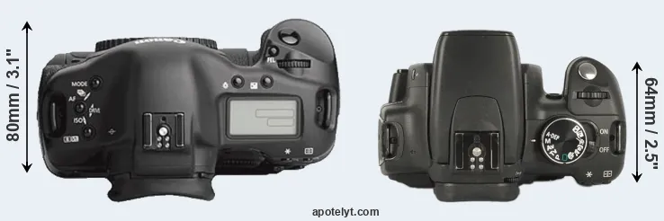 The side-by-side display below illustrates the physical size and weight of the Canon 1Ds Mark III and the Canon 350D. The two cameras are presented according to their relative size. Three successive views from the front, the top, and the rear are shown. All size dimensions are rounded to the nearest millimeter.