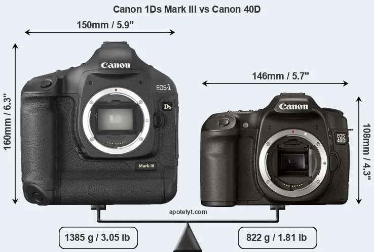 If the front view area (width x height) of the cameras is taken as an aggregate measure of their size, the Canon 40D is considerably smaller (34 percent) than the Canon 1Ds Mark III. Moreover, the 40D is substantially lighter (41 percent) than the 1Ds Mark III. It is worth mentioning in this context that the 1Ds Mark III is splash and dust resistant, while the 40D does not feature any corresponding weather-sealing.