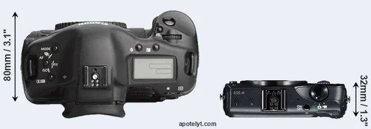 The physical size and weight of the Canon 1Ds Mark III and the Canon M are illustrated in the side-by-side display below. The two cameras are presented according to their relative size. Three consecutive views from the front, the top, and the rear side are shown. All size dimensions are rounded to the nearest millimeter.