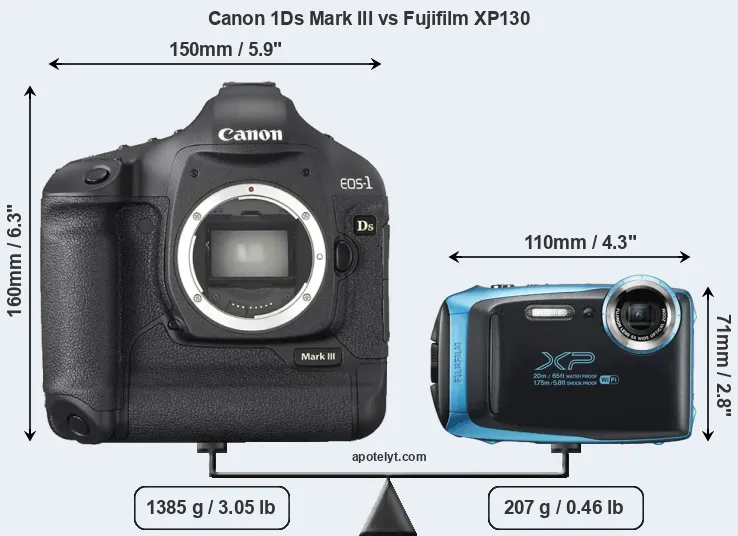 An illustration of the physical size and weight of the Canon 1Ds Mark III and the Fujifilm XP130 is provided in the side-by-side display below. The two cameras are presented according to their relative size. Three successive views from the front, the top, and the rear are shown. All width, height and depth dimensions are rounded to the nearest millimeter.