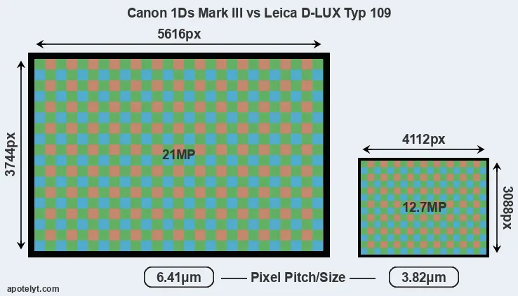 With 21MP, the 1Ds Mark III offers a higher resolution than the D-LUX Typ 109 (12.7MP), but the 1Ds Mark III nevertheless has larger individual pixels (pixel pitch of 6.41μm versus 3.82μm for the D-LUX Typ 109) due to its larger sensor. However, the D-LUX Typ 109 is a much more recent model (by 7 years) than the 1Ds Mark III, and its sensor will have benefitted from technological advances during this time that further enhance the light gathering capacity of its pixels.