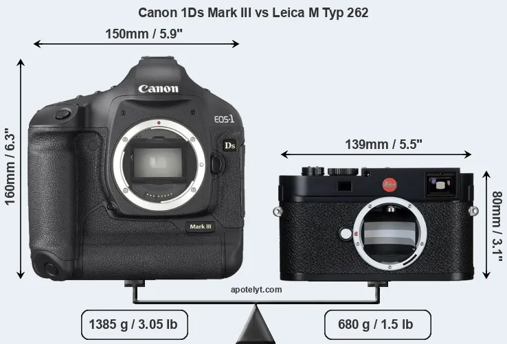 The physical size and weight of the Canon 1Ds Mark III and the Leica M Typ 262 are illustrated in the side-by-side display below. The two cameras are presented according to their relative size. Three consecutive perspectives from the front, the top, and the back are available. All width, height and depth measures are rounded to the nearest millimeter.