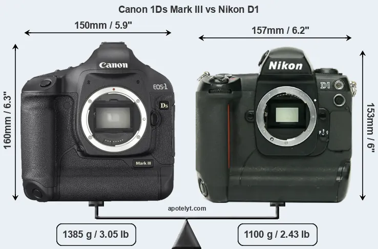 If the front view area (width x height) of the cameras is taken as an aggregate measure of their size, the Canon 1Ds Mark III and the Nikon D1 are of equal size. However, the D1 is markedly lighter (21 percent) than the 1Ds Mark III. In this context, it is worth noting that both cameras are splash and dust-proof and can, hence, be used in inclement weather conditions or harsh environments.