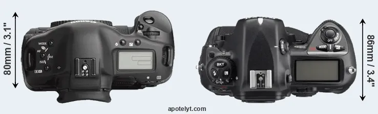 The physical size and weight of the Canon 1Ds Mark III and the Nikon D2Xs are illustrated in the side-by-side display below. The two cameras are presented according to their relative size. Three consecutive views from the front, the top, and the rear side are shown. All size dimensions are rounded to the nearest millimeter.