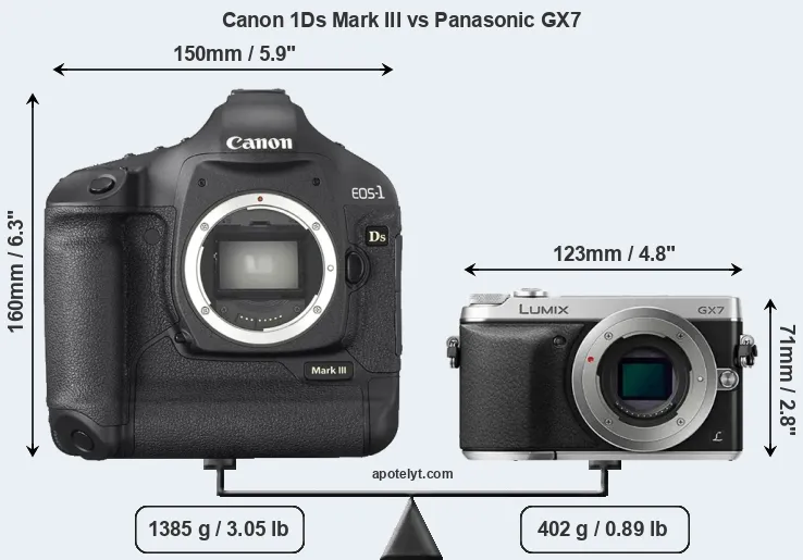 The side-by-side display below illustrates the physical size and weight of the Canon 1Ds Mark III and the Panasonic GX7. The two cameras are presented according to their relative size. Three consecutive perspectives from the front, the top, and the back are available. All width, height and depth measures are rounded to the nearest millimeter.