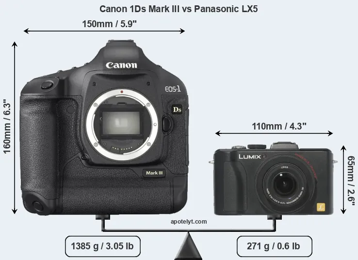 If the front view area (width x height) of the cameras is taken as an aggregate measure of their size, the Panasonic LX5 is considerably smaller (70 percent) than the Canon 1Ds Mark III. It is worth mentioning in this context that the 1Ds Mark III is splash and dust resistant, while the LX5 does not feature any corresponding weather-sealing.