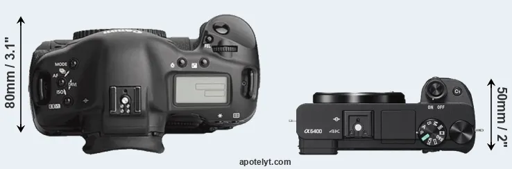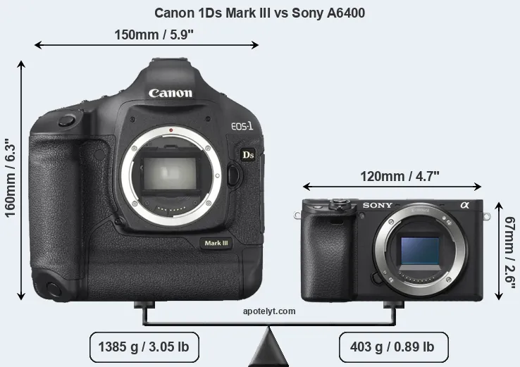 The physical size and weight of the Canon 1Ds Mark III and the Sony A6400 are illustrated in the side-by-side display below. The two cameras are presented according to their relative size. Three successive views from the front, the top, and the rear are shown. All width, height and depth measures are rounded to the nearest millimeter.