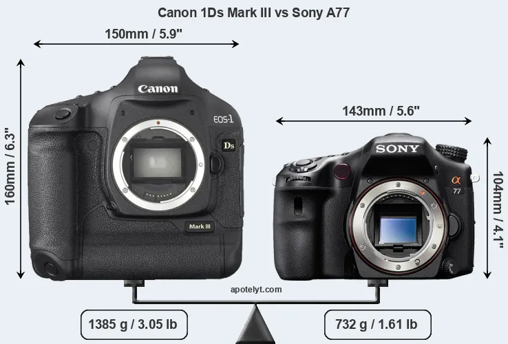 An illustration of the physical size and weight of the Canon 1Ds Mark III and the Sony A77 is provided in the side-by-side display below. The two cameras are presented according to their relative size. Three successive views from the front, the top, and the rear are shown. All width, height and depth dimensions are rounded to the nearest millimeter.