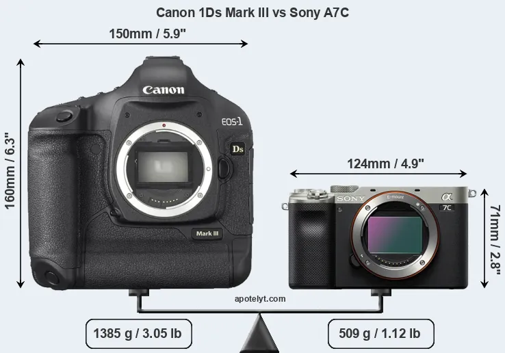 The physical size and weight of the Canon 1Ds Mark III and the Sony A7C are illustrated in the side-by-side display below. The two cameras are presented according to their relative size. Three consecutive perspectives from the front, the top, and the back are available. All width, height and depth dimensions are rounded to the nearest millimeter.