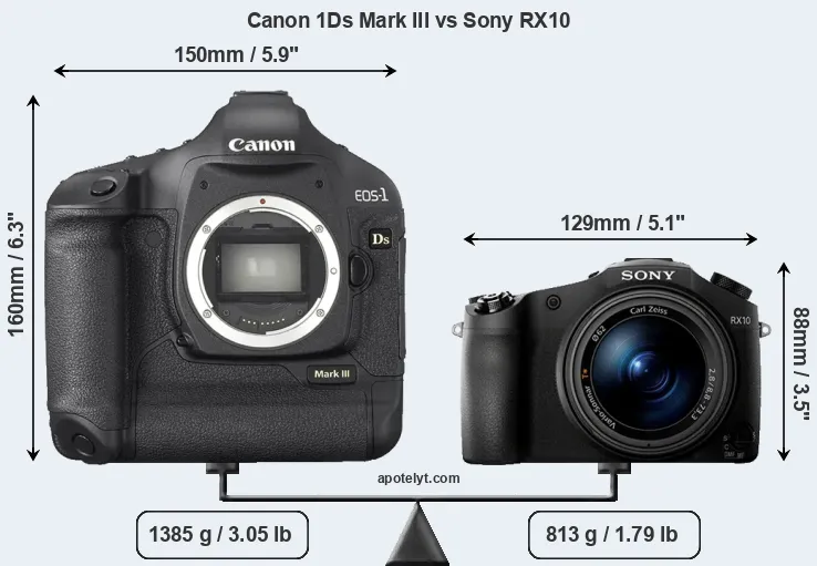 An illustration of the physical size and weight of the Canon 1Ds Mark III and the Sony RX10 is provided in the side-by-side display below. The two cameras are presented according to their relative size. Three consecutive views from the front, the top, and the rear side are shown. All size dimensions are rounded to the nearest millimeter.