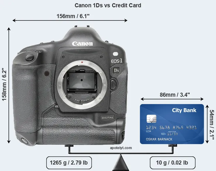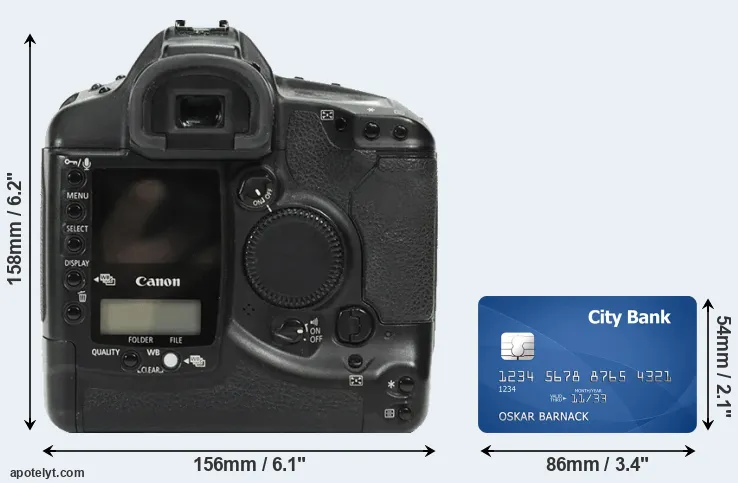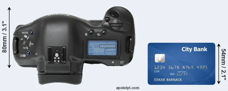 The side-by-side display below illustrates the physical size of the Canon 1Ds vis-à-vis a credit card. Three consecutive perspectives from the front, the top, and the back are presented. All size dimensions are rounded to the nearest millimeter.