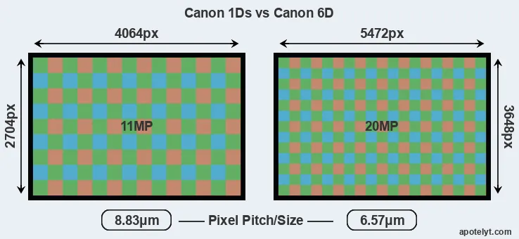With 20MP, the 6D offers a higher resolution than the 1Ds (11MP), but the 6D has smaller individual pixels (pixel pitch of 6.57μm versus 8.83μm for the 1Ds). Yet, the 6D is a much more recent model (by 9 years and 11 months) than the 1Ds, and its sensor will have benefitted from technological advances during this time that enhance the light gathering capacity of its pixel-units.