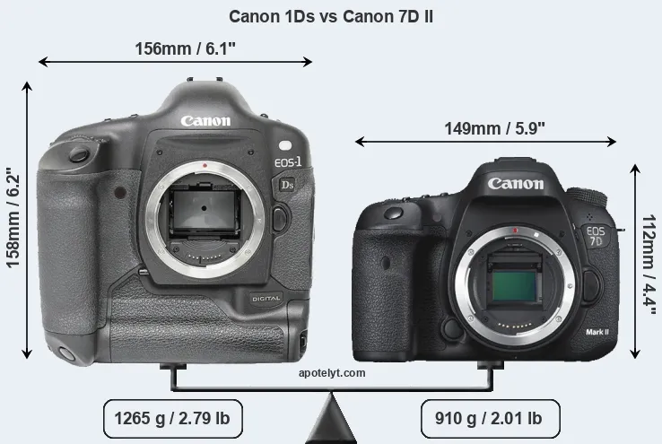The physical size and weight of the Canon 1Ds and the Canon 7D II are illustrated in the side-by-side display below. The two cameras are presented according to their relative size. Three consecutive perspectives from the front, the top, and the back are available. All size dimensions are rounded to the nearest millimeter.