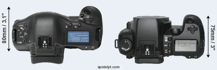 The above size and weight comparisons are to some extent incomplete since they do not consider the interchangeable lenses that both of these cameras require. A larger imaging sensor (as in the 1Ds) will tend to go along with bigger and heavier lenses, while more compact options are available for the smaller-sensor camera (D30). You can compare the optics available in the Canon EF Lens Catalog.