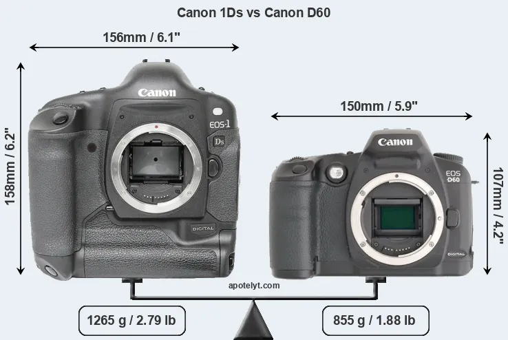 The physical size and weight of the Canon 1Ds and the Canon D60 are illustrated in the side-by-side display below. The two cameras are presented according to their relative size. Three consecutive perspectives from the front, the top, and the back are available. All width, height and depth dimensions are rounded to the nearest millimeter.