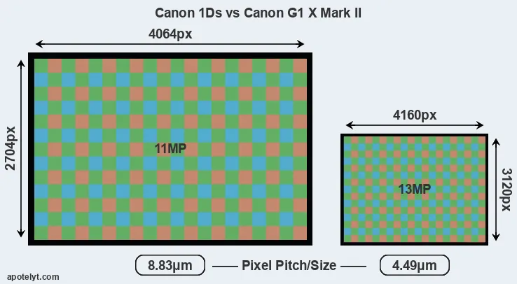 Despite having a smaller sensor, the G1X Mark II offers a higher resolution of 13 megapixels, compared with 11 MP of the 1Ds. This megapixels advantage comes at the cost of a higher pixel density and a smaller size of the individual pixel (with a pixel pitch of 4.49μm versus 8.83μm for the 1Ds). However, it should be noted that the G1X Mark II is much more recent (by 11 years and 4 months) than the 1Ds, and its sensor will have benefitted from technological advances during this time that make it possible to gather light more efficiently.